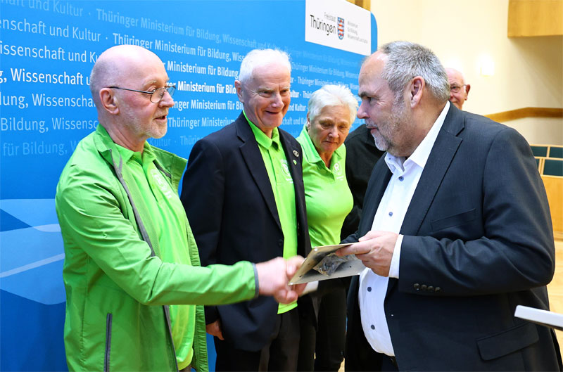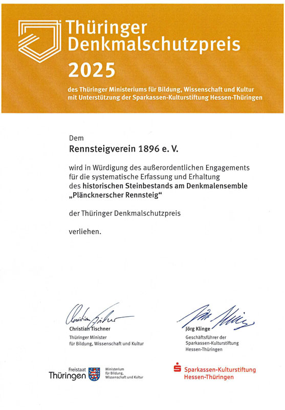 Verleihung des "Thüringer Denkmalschutzpreises" 2025 am 20.11.2025 an den Rennsteigverein 1896 e.V. Urkunde "Thüringer Denkmalschutzpreis" 2025 (pdf-Datei) Preisträgerheft "Thüringer Denkmalschutzpreis" 2025 (pdf-Datei) Fotos von der Verleihung